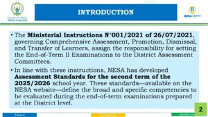 Mu rwego rwo gukomeza kunoza ireme ry’uburezi mu Rwanda no gushyira mu bikorwa integanyanyigisho ishingiye ku bushobozi (Competence-Based Curriculum – CBC), hashyizweho amahame mashya agenga isuzuma risoza igihembwe cya kabiri mu mwaka w’amashuri wa 2025/2026. Aya mahame yateguwe na NESA kandi ashingiye ku mabwiriza ya Minisitiri N°001/2021 yo ku wa 26/07/2021 agena uko abanyeshuri basuzumwa, bazamurwa mu byiciro, bahagarikwa cyangwa bimurirwa ahandi.